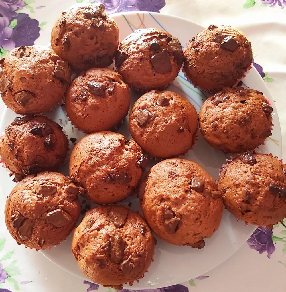 V skledo najprej stresi jogurt, da dobiš prazen lonček, ki ga imaš za merico. Nato dodaj vse ostale sestavine po enakem vrstnem redu kot je zgoraj omenjeno. Vse sestavine zmešaj z mešalnikom. Na koncu z nožem čokolado nareži na majhne koščke. V pladenj za peko mafinov vstavi papirčke in maso lepo razporedi. Modelčke napolni malo pred vrhom recimo za prst pod robom. Na koncu posipaj z koščki čokolade. Čokolada naj vsebuje vsaj 70% kakava, če vsebuje še več pa toliko boljše. V segreti pečici peči pri 180 stopinjah 20 minut.